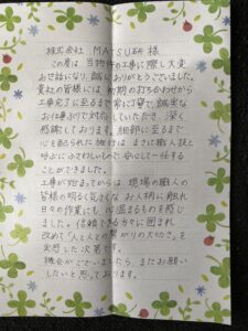 貴社の皆様には、初期の打ち合わせから工事完了に至るまでに、常に丁寧で誠実なお仕事ぶりで対応していただき、深く感謝しております。